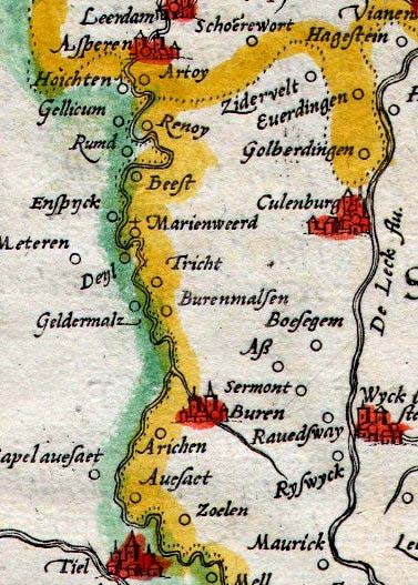 Meer over Beusichem in de Tielerwaard overgenomen van een locale site. Detail van een oude kaart uit 1605.
